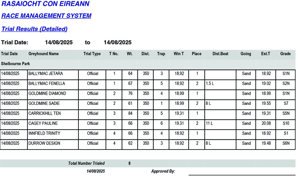 SHELBOURNE PARK TRIAL RESULTS THURSDAY 14/08/2025