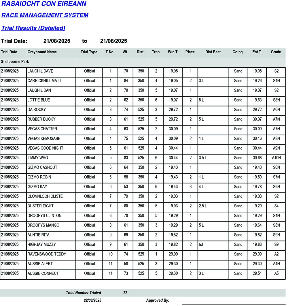 SHELBOURNE PARK TRIAL RESULTS THURSDAY 21/08/2025