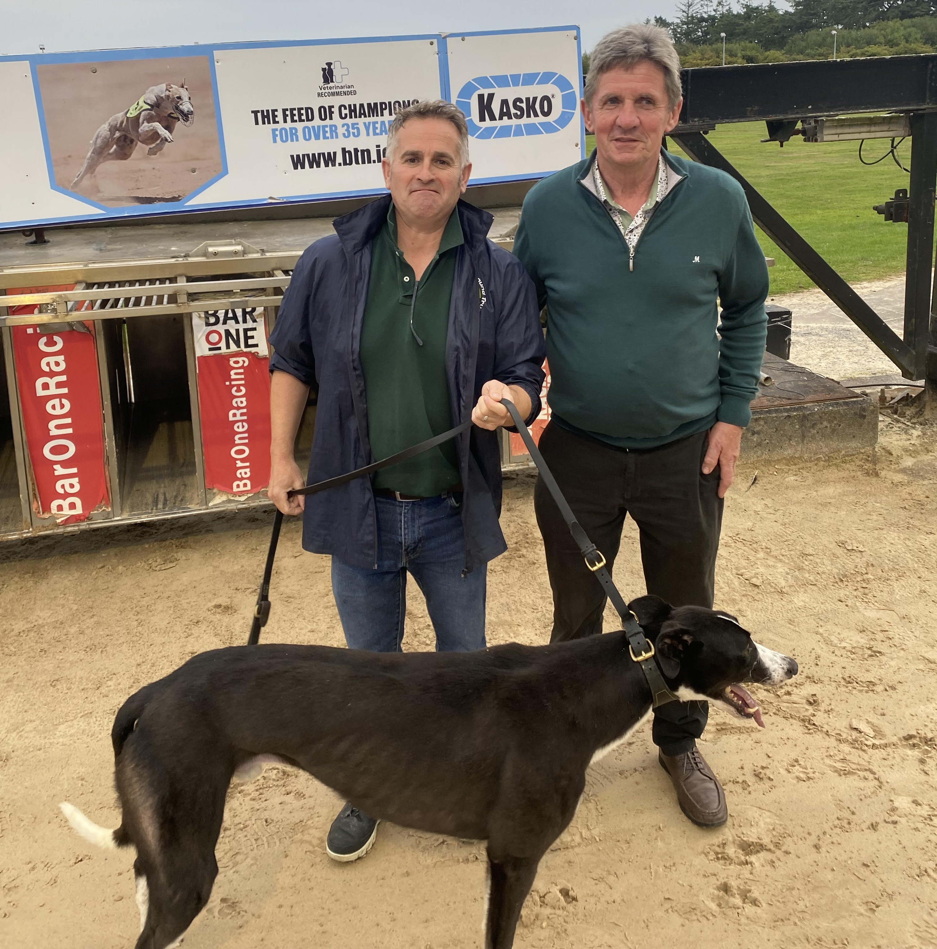 The well-backed even money favourite (Pic right with) John Linehan and Mossie O’Leary after Droopys Sort clocked a top class 28:07 in the opening round of the A1 Kasko Derby.  displayed plenty of early dash to slip around in front and in truth, the September puppy was always in control up front. Clocking a top class 15.97 down into the third corner, the impressive winner then stayed on strongly to beat Priceless Romeo, by four and a half lengths, in 28.07.