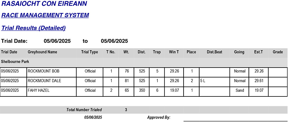 Shelbourne Park Trial Results Thursday 5/06/2025: