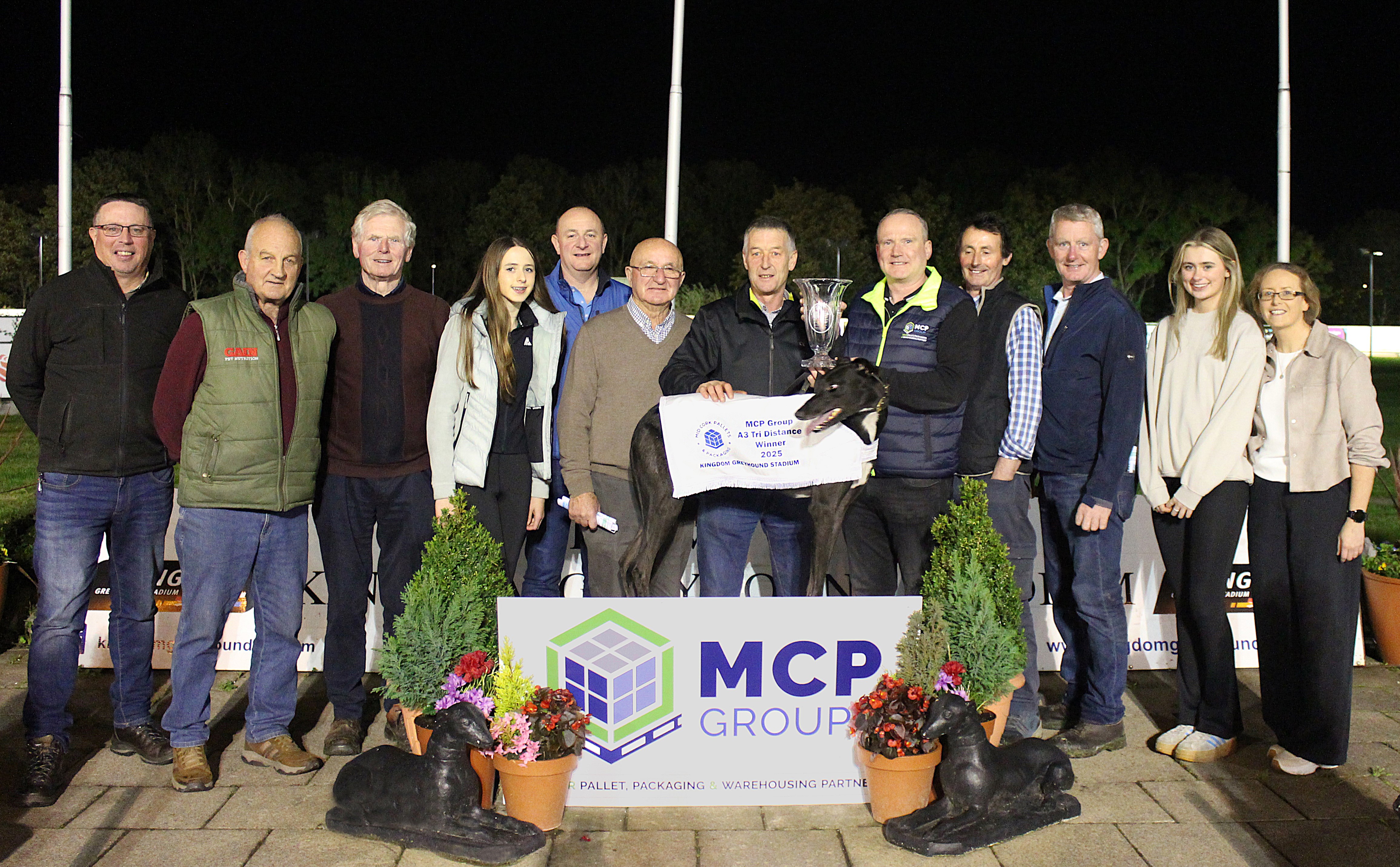 Pictured: Aidan Harty of MCP Group with Maurice, Liam & Erin Harty making the winning presentation to owner Richard Gentleman after Garrison Dundee won Final of the MCP Group Tri Distance Stakes at Tralee on Friday night.
