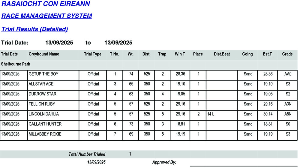 Shelbourne Park Trial Results Saturday 13/09/2025: