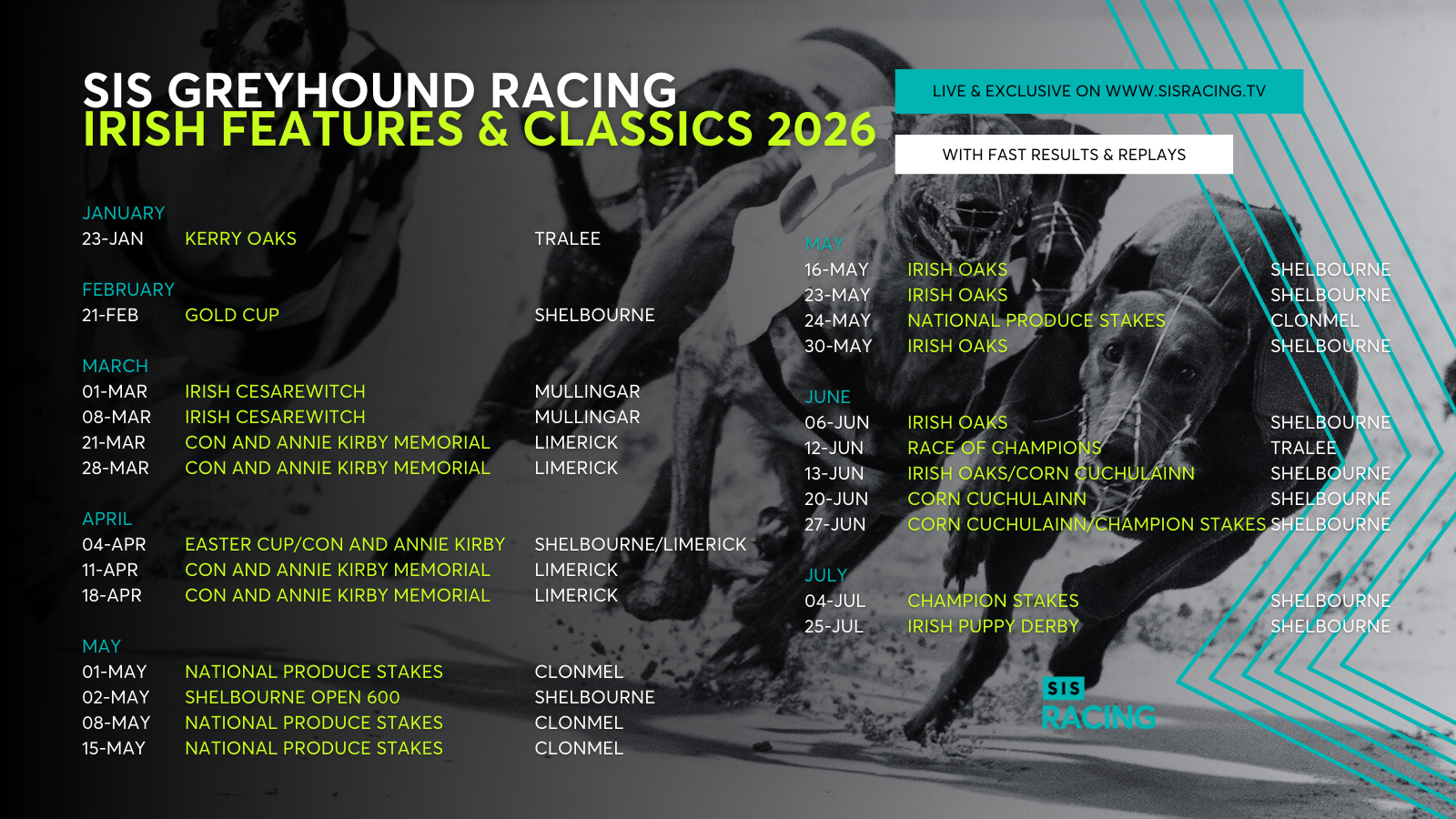 GREYHOUND Racing Ireland and SIS have jointly announced planned big race coverage for 2026 which will include earlier rounds in major competitions such as the Con & Annie Kirby Memorial, Irish Oaks, Irish Laurels and Irish St Leger.