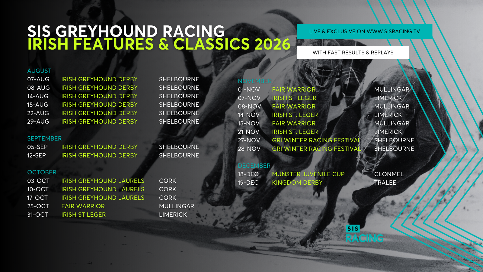 Ryan Corrie, greyhound operations manager for SIS, said: "Thanks to our excellent long-standing relationship with GRI, and after record coverage of major Irish racing meetings this year, we are delighted to publish the schedule for 2026.