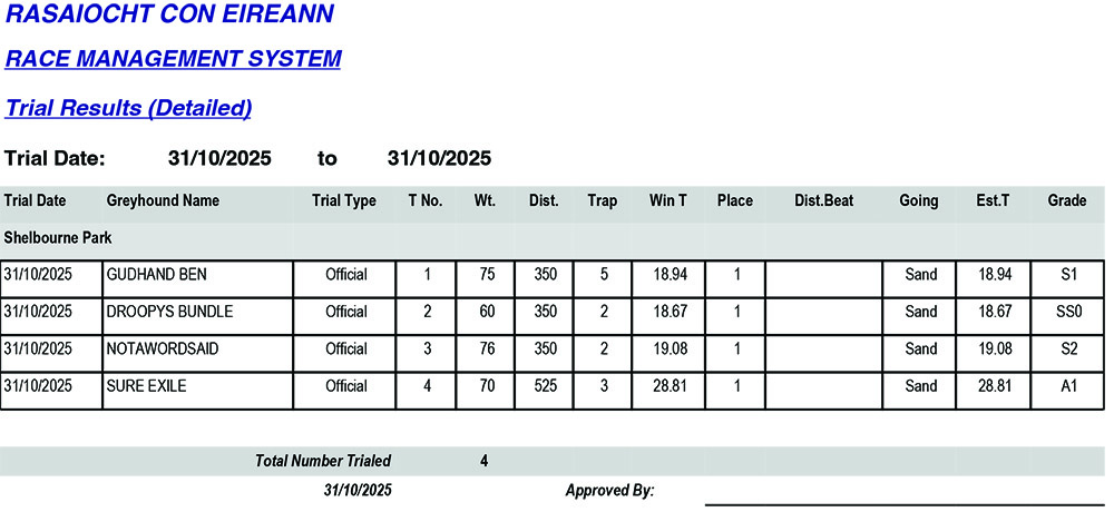 SHELBOURNE PARK TRIAL RESULTS FRIDAY 31/10/2025