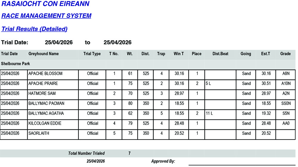 Shelbourne Park Trial Results Saturday 25/4/2026:
