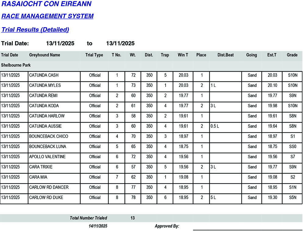 Shelbourne Park Trial Results Thursday 13/11/2025:
