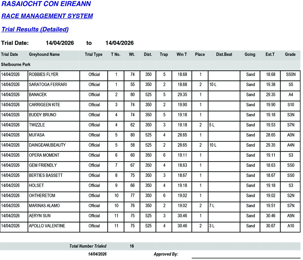 • SHELBOURNE PARK TRIAL RESULTS TUESDAY 14/4/2026