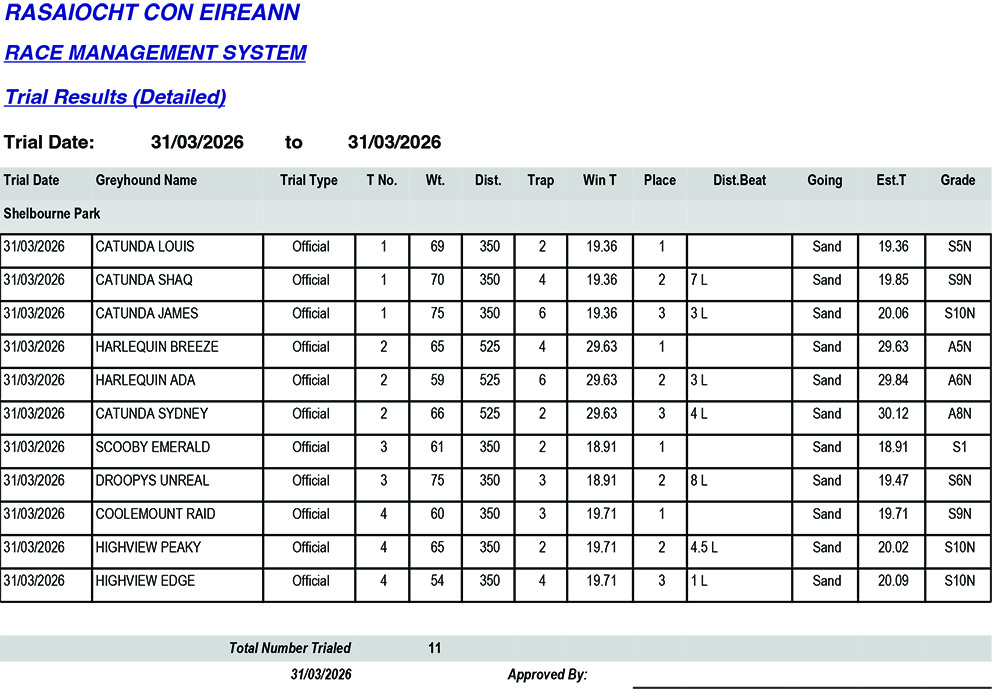 SHELBOURNE PARK TRIAL RESULTS TUESDAY 31/3/2026