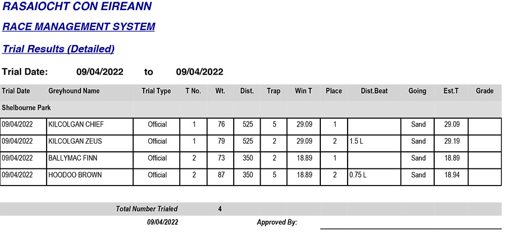 SHELBOURNE PARK TRIAL RESULTS, FRIDAY 29/04/2022