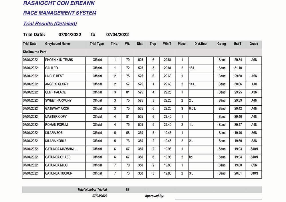 Shelbourne Park Trial Results, Thursday 7/04/2022: