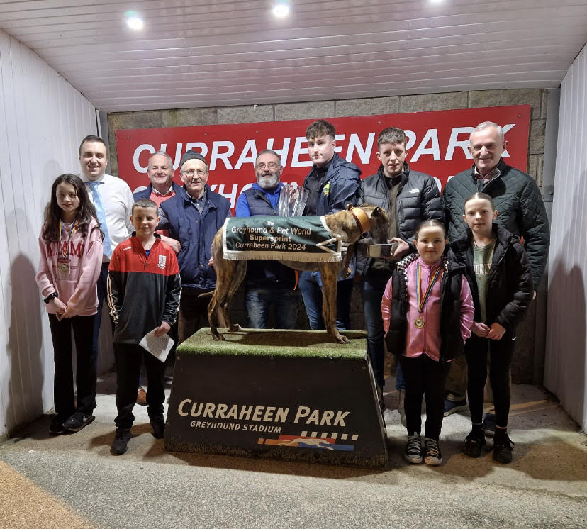 Liam Murphy (Greyhound & Petworld) making the presentation to Ciaran O’Sullivan after Road Exile landed the Greyhound & Petworld Supersprint at Curraheen Park. Also included is Darren Hogan (Curraheen Park Racing Team), GRI Board Members Alex Grassick and Richie O’Regan along with friends and supporters.