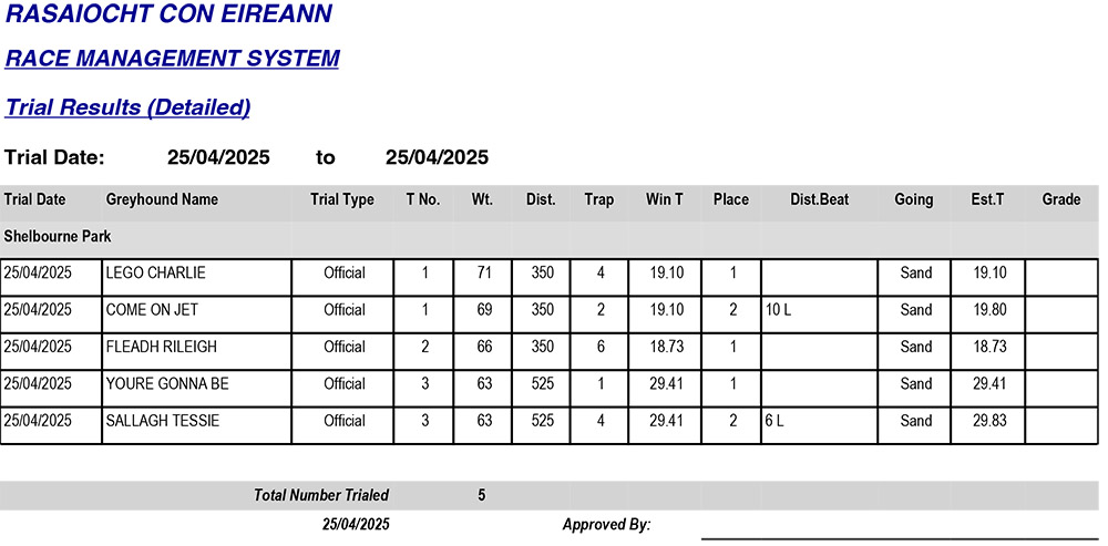 Shelbourne Park Trial Results, Friday 25/4/2025:
