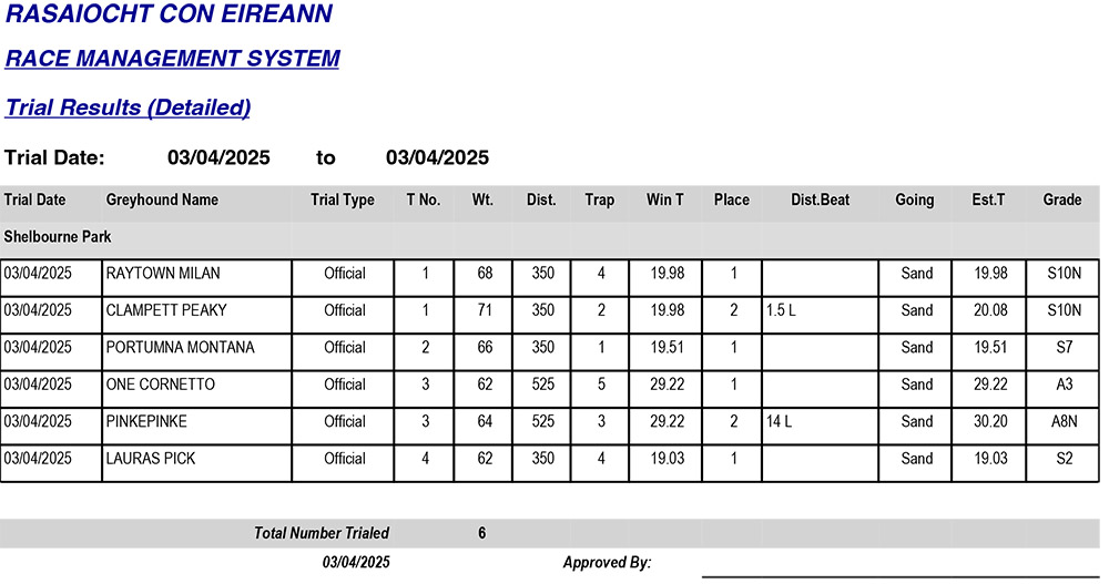 Shelbourne Park Trial Results, Thursday 3/4/2025: