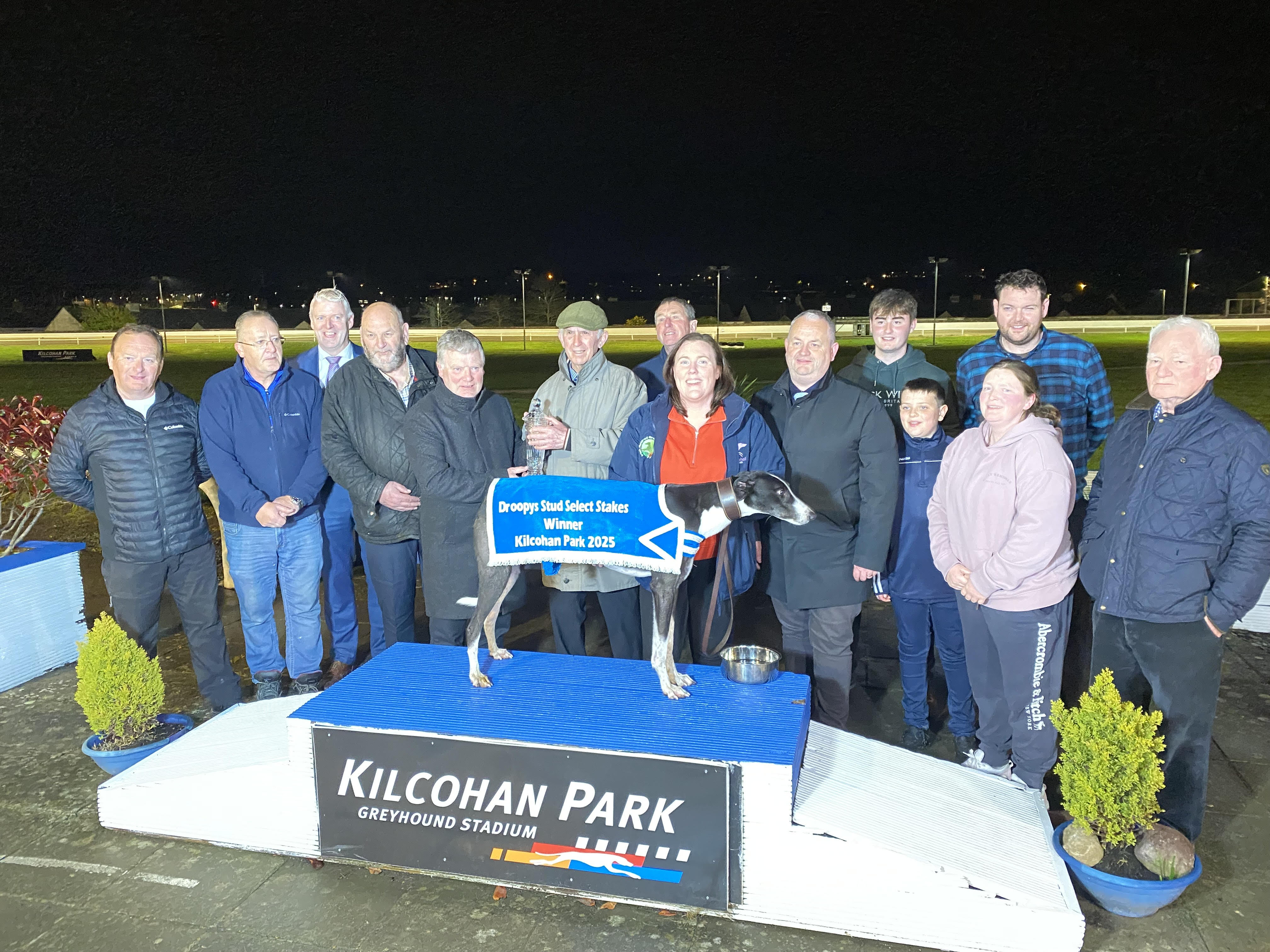 Seven Beach, trained by Jennifer O’Donnell for owners The Beach Boys Trio Syndicate, delivers a stunning performance to win the €10,000 to the winner Droopys Stud Select Stakes at Kilcohan Park. Michael Dunphy (Droopys Stud) making the presentation to winning connections.