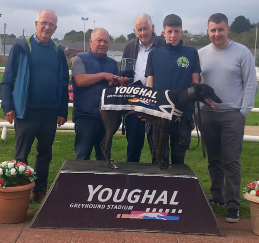 On Tuesday night in Youghal, litter sister Pretty Exile (Pic right:) Pretty Exile with John Hickey & Stevie Motherway (Y.T.S.C) present the winning trophy to Andy Lynch (winning owner).
