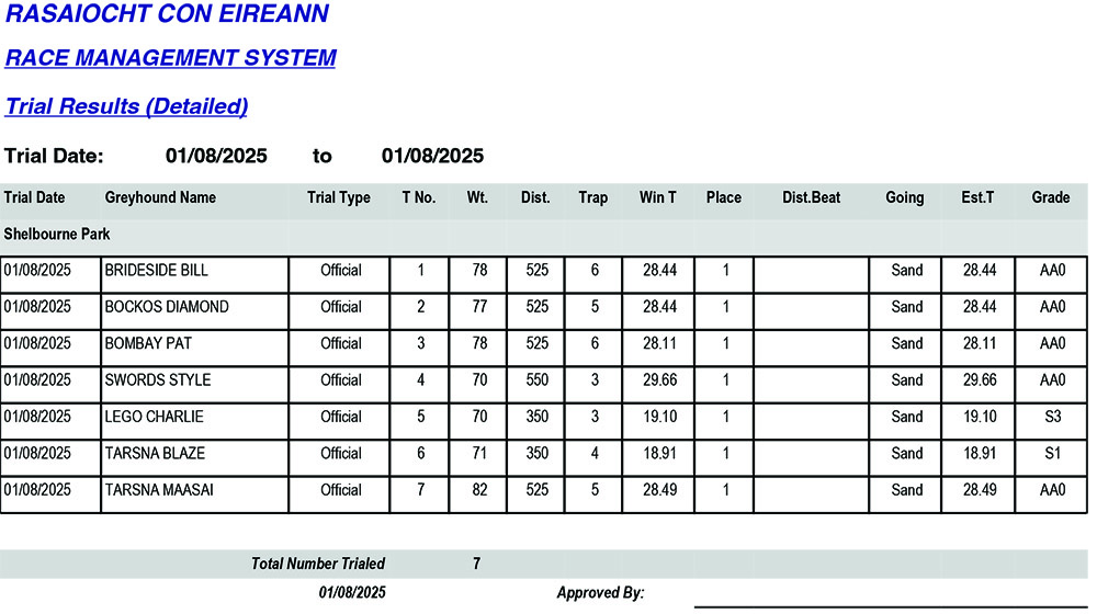 Shelbourne Park Trial Results Friday 1/08/2025: