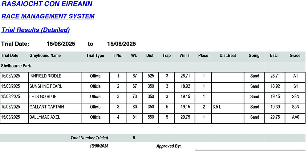 SHELBOURNE PARK TRIAL RESULTS FRIDAY 15/08/2025