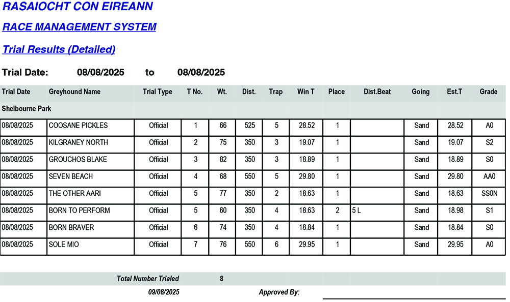 Shelbourne Park Trial Results Friday 8/08/2025: