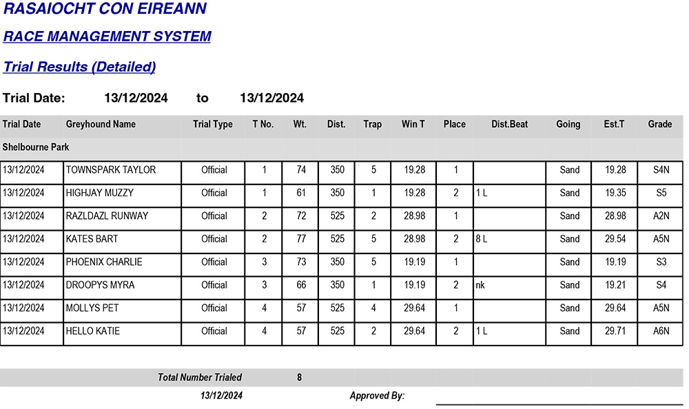 Shelbourne Park Trial Results, Friday 13/12/2024: