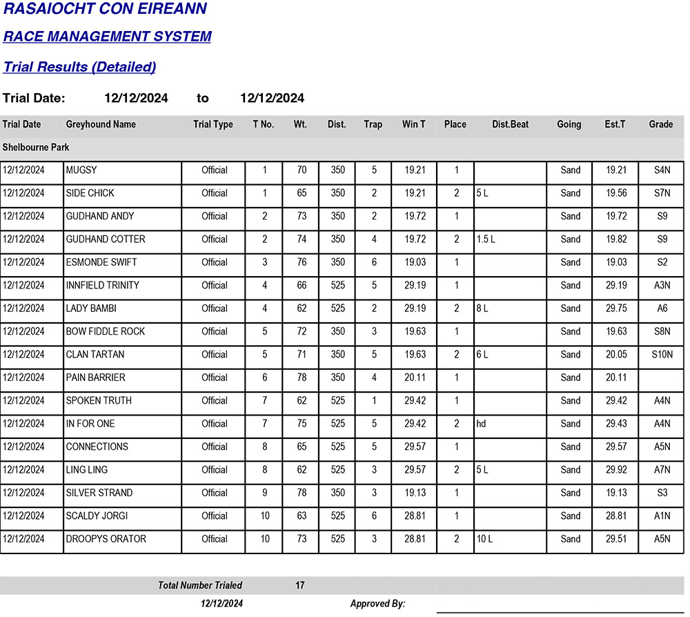 Shelbourne Park Trial Results, Thursday 12/12/2024: