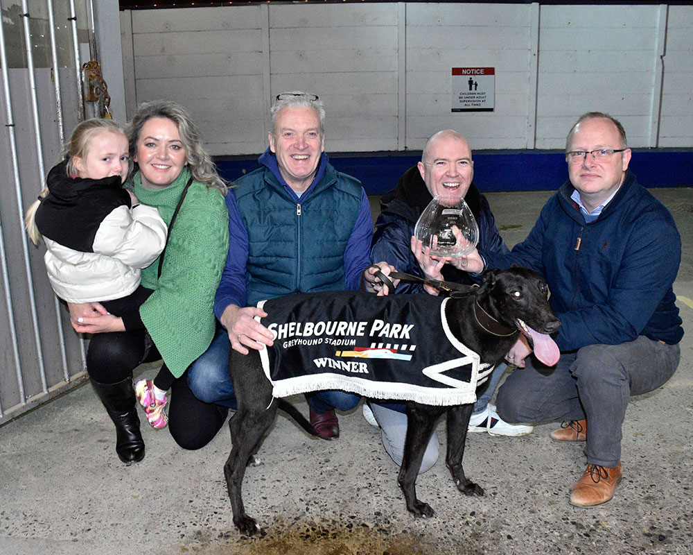 Michael Dempsy Racing Manager Shelbourne Park presents the trophy to Barry Caul after Black Bridges won the Barking Buzz App A3 Bitch 525 Final. Also included are Dominic, Nicole and Charley Caul. Pic: Imelda Grauer