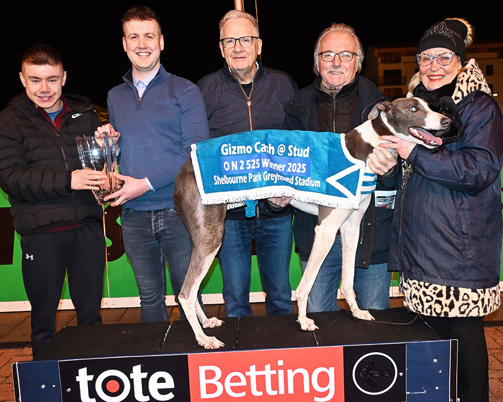 Dylan Brennan Racing Manager Shelbourne Park presents the trophy to Daniel Comerford after Lombardy won the Gizmo Cash @ Stud ON2/ON3 525. Also included are owner Aidan Comerford, trainer Marie Gilbert and Des Gilbert. Pic: Imelda Grauer