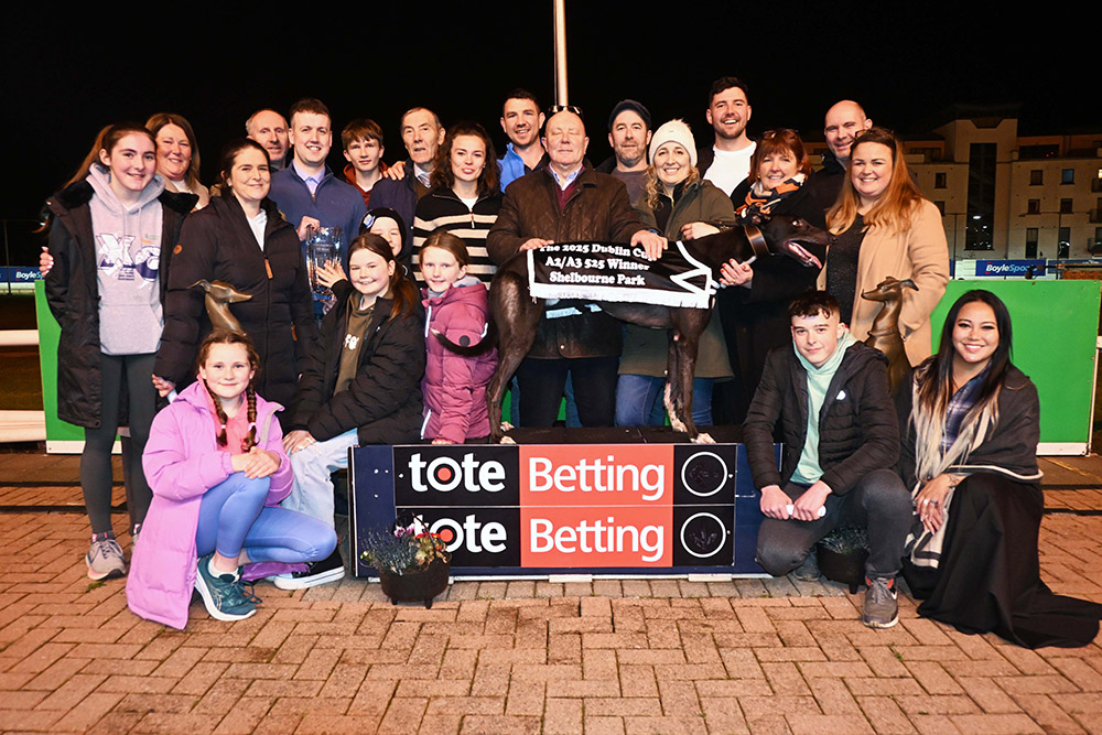 Dylan Brennan Racing Manager Shelbourne Park presents the trophy to Oisin De Buitlear and the De Buitlear Syndicate and Fan Club after Skidrow Joe won the 2025 Dublin Cup final. Also included is Sian McKenna wife of trainer Owen McKenna. Pic: Imelda Grauer