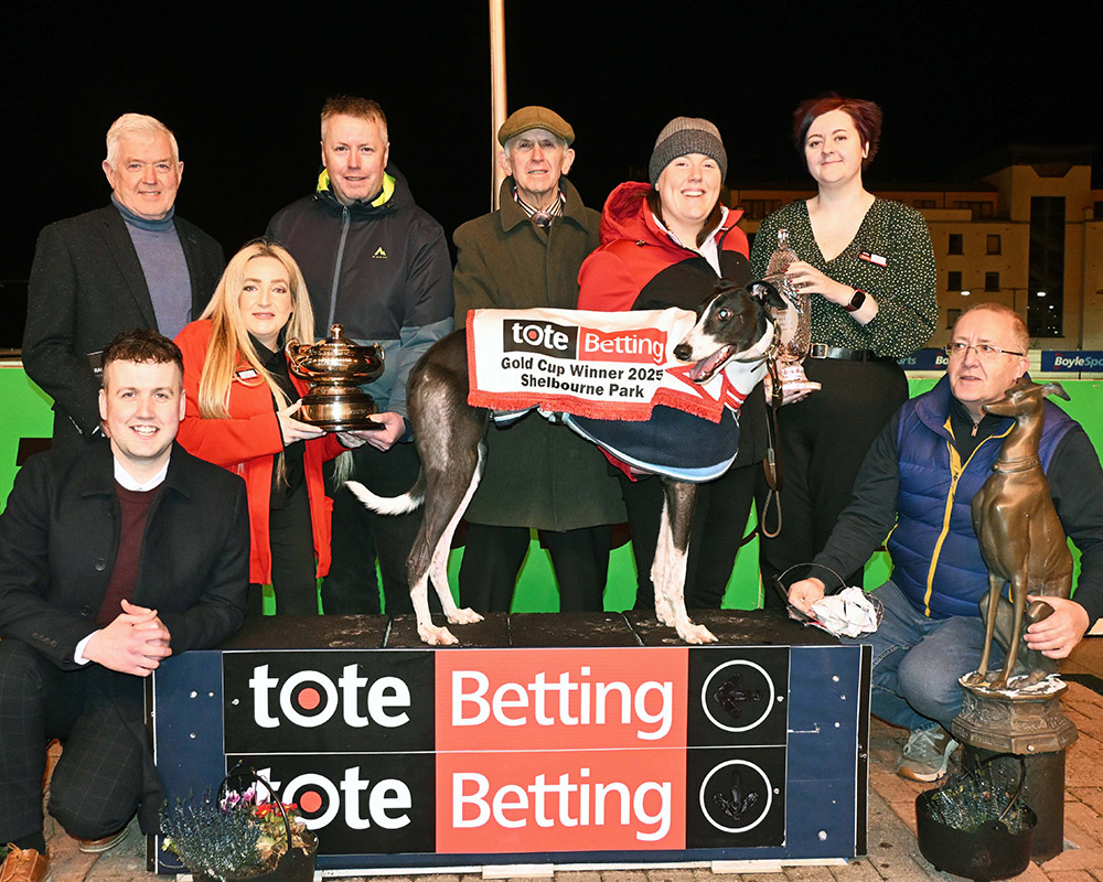 Amy Fitzsimons Customer Care Shelbourne Park presents the trophy to John Mitchell after Seven Beach won the 2025 Tote Gold Cup and Kelsey Sullivan presents a replica trophy to trainer Jennifer O'Donnell. Also included are Pat Flanagan Chairman GRI, Dylan Brennan Racing Manager Shelbourne Park, Tony Mitchell and Seamie Kent. Pic: Imelda Grauer