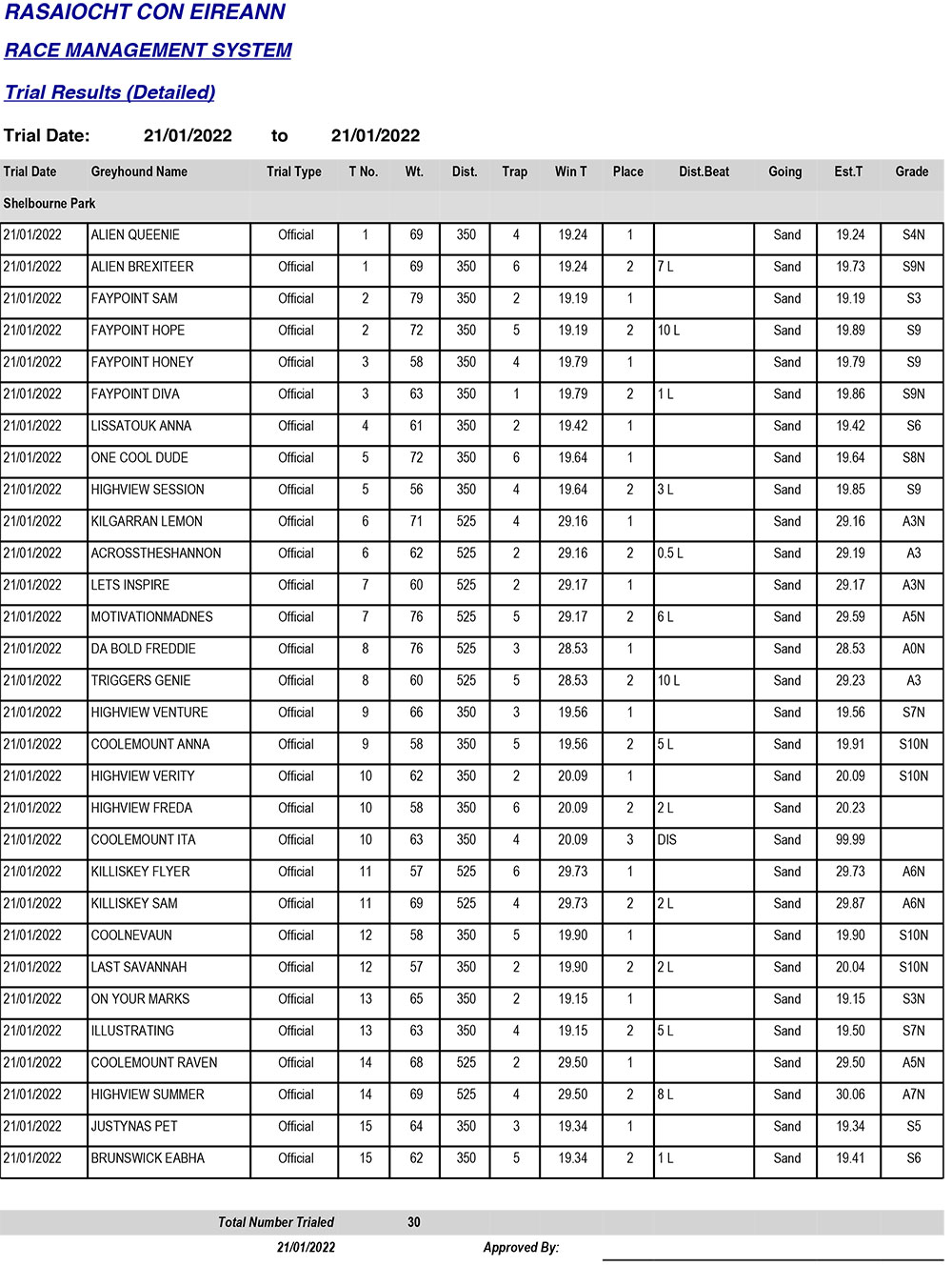 SHELBOURNE PARK TRIAL RESULTS, FRIDAY 21/01/2022