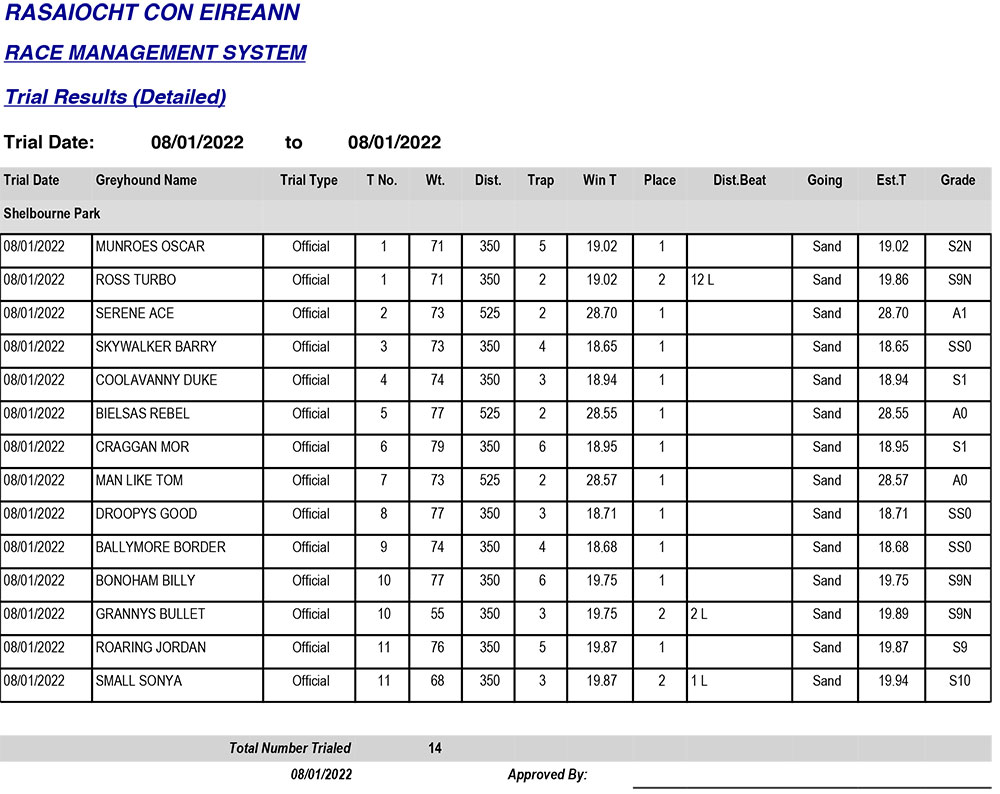 Shelbourne Park Trial Results, Saturday 08/01/2022: