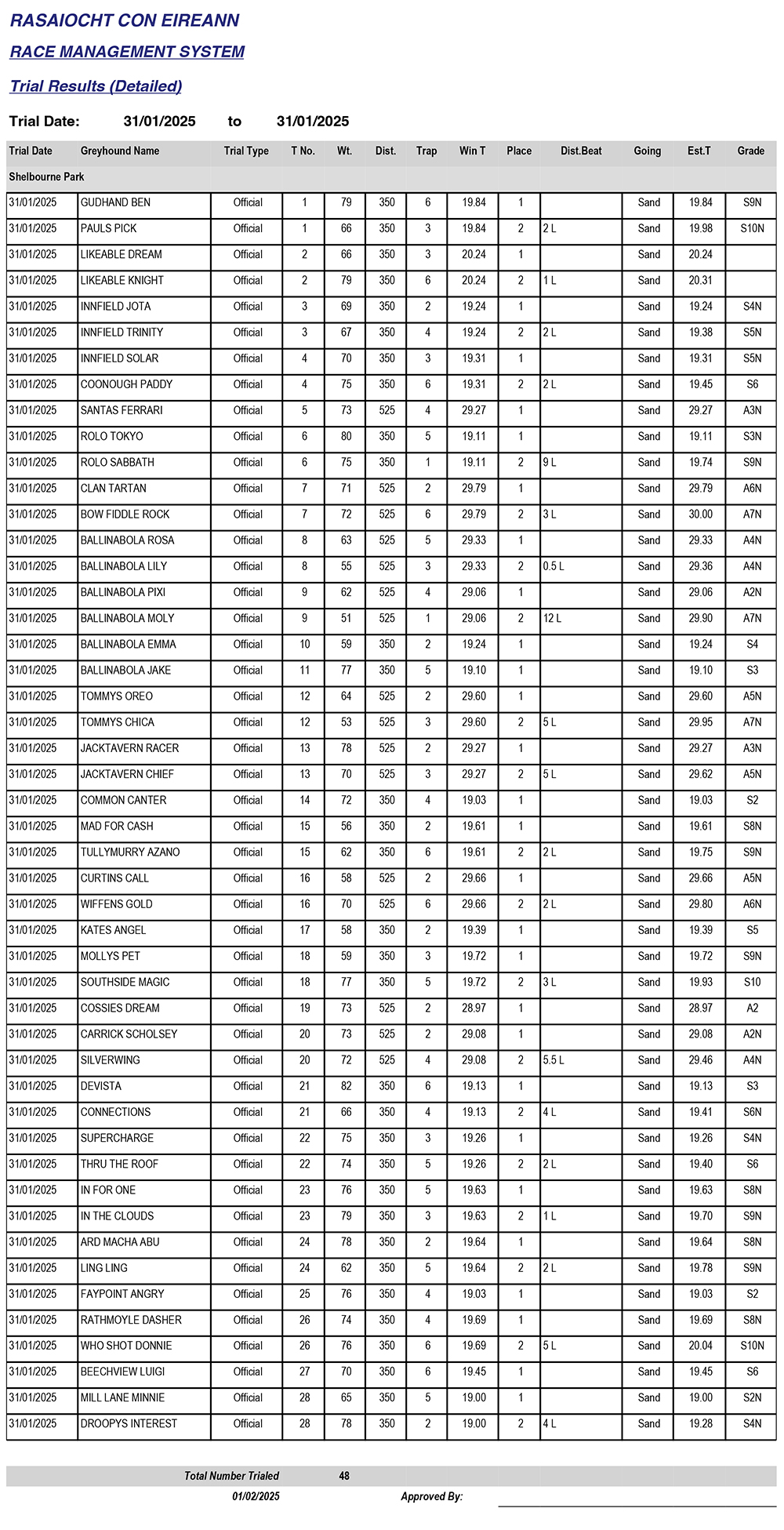 Shelbourne Park Trial Results, Friday 31/1/2025: