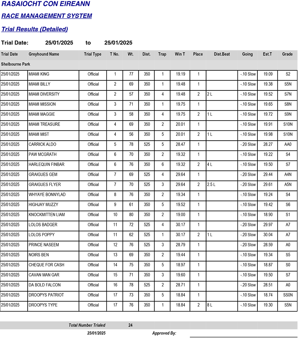 Shelbourne Park Trial Results, Saturday 25/1/2025: