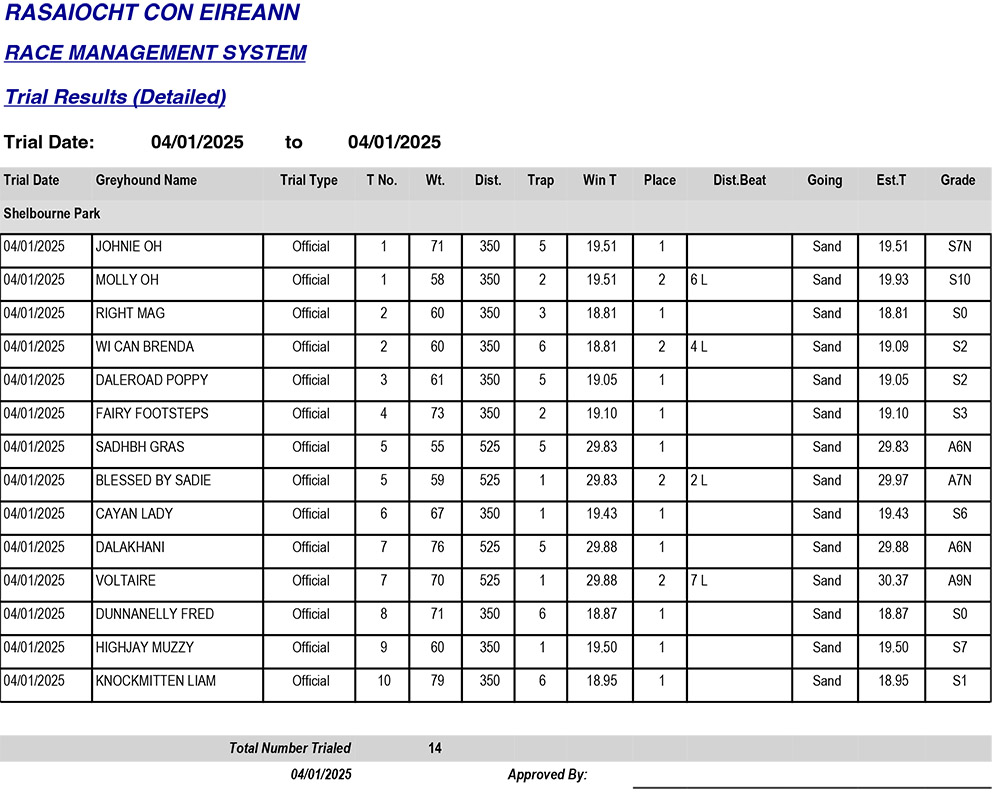 Shelbourne Park Trial Results, Saturday 4/1/2025: