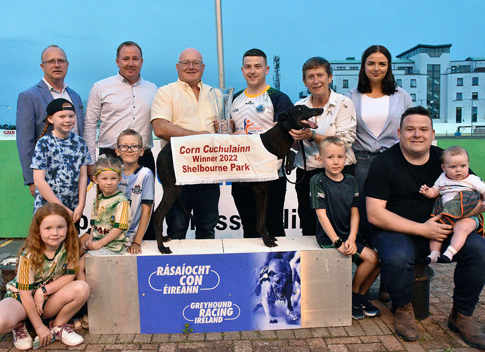 William Rigney presents the trophy to Peter Divilly owner of Crafty Kokora winner of the 2022 Corn Cuchulainn Open 750 at Shelbourne Park. Also included are Michael Dempsy Racing Manager Shelbourne Park, Noelle, Snake and Johnnie Divilly, Eimear O'Dwyer, Wayne McCarthy GRI, Cillian and Jack McCarthy, Cara, Darcie and Ruby Reynolds. Pic: Imelda Grauer