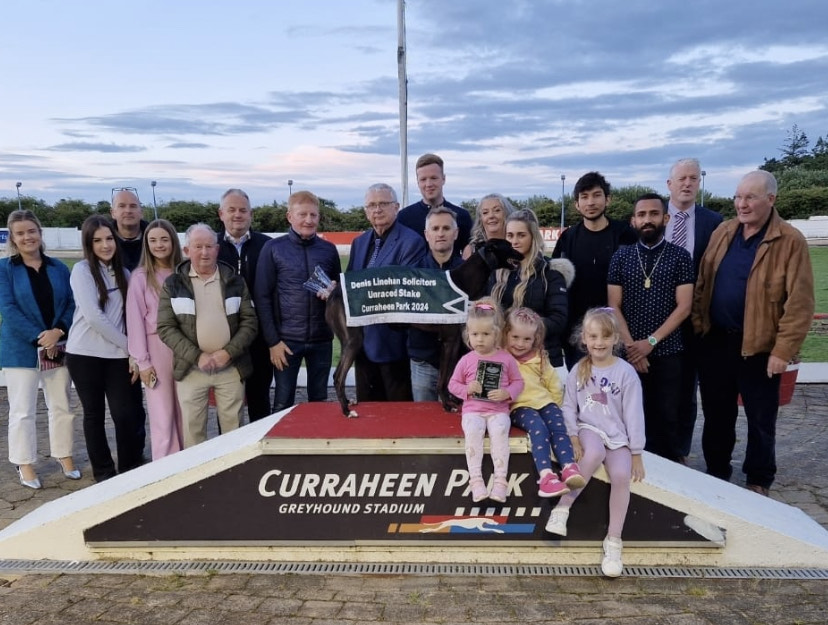 DROOPYS PLUNGE (Droopys Sydney-Droopys Sweet), trained by Johnny Linehan for Roy Ball and Trevor Pearson, ran out a brilliant winner of the 2024 Denis Linehan Solicitors Open Unraced Stake at Curraheen Park on Saturday night.
