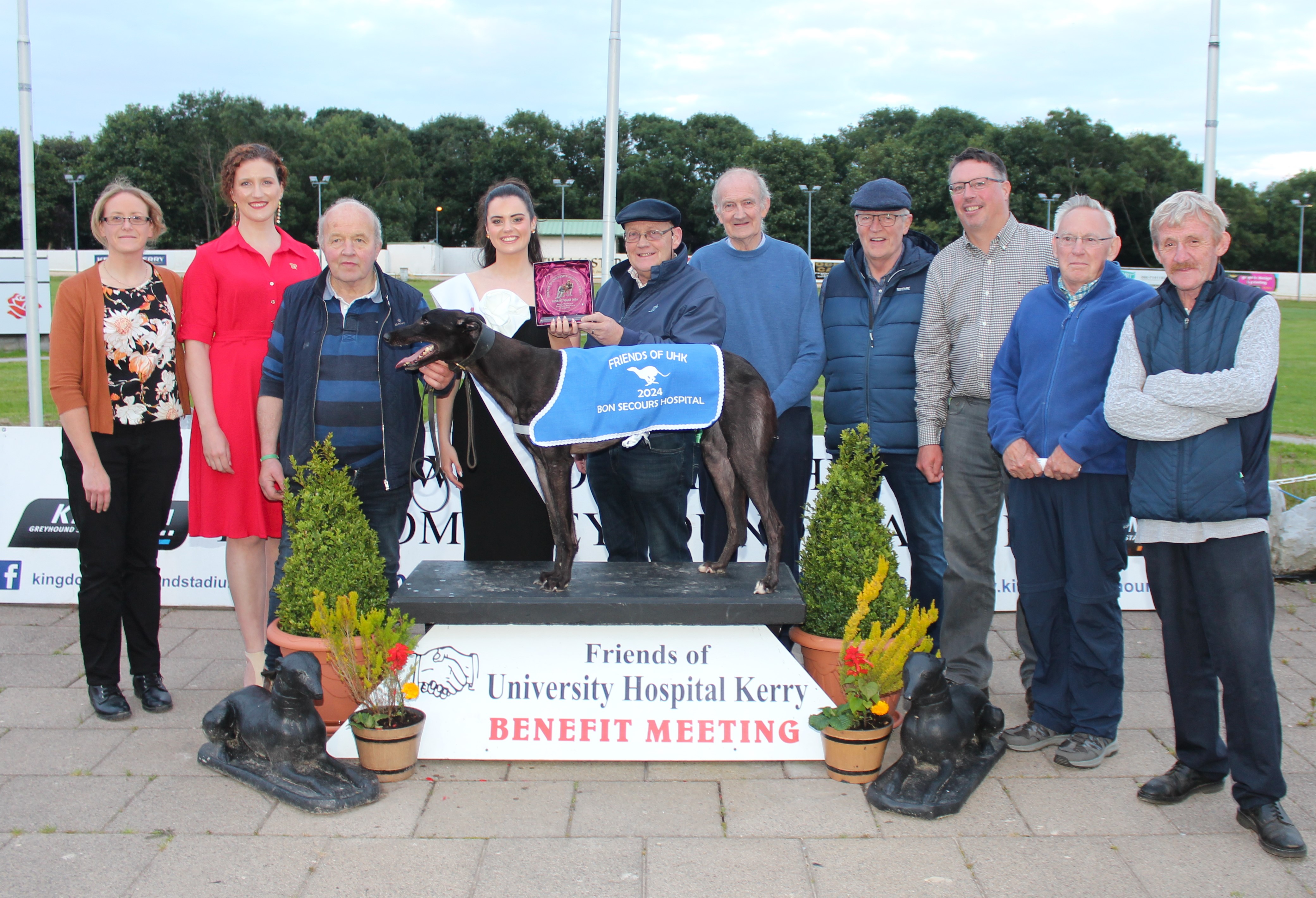 Pictured With the Friends of UHK, 2024 Kerry Rose Eimear Dineen making the winning presentation to owner Thomas Lynch and trainer Neilus O'Connell following Val Tashadelek's win in the 2024 Hospital Sweep Final at the Kingdom Greyhound Stadium