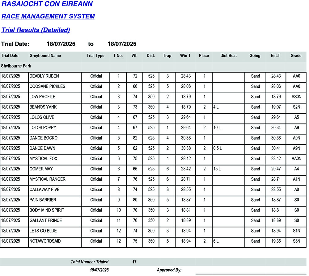 Shelbourne Park Trial Results Friday 18/07/2025: