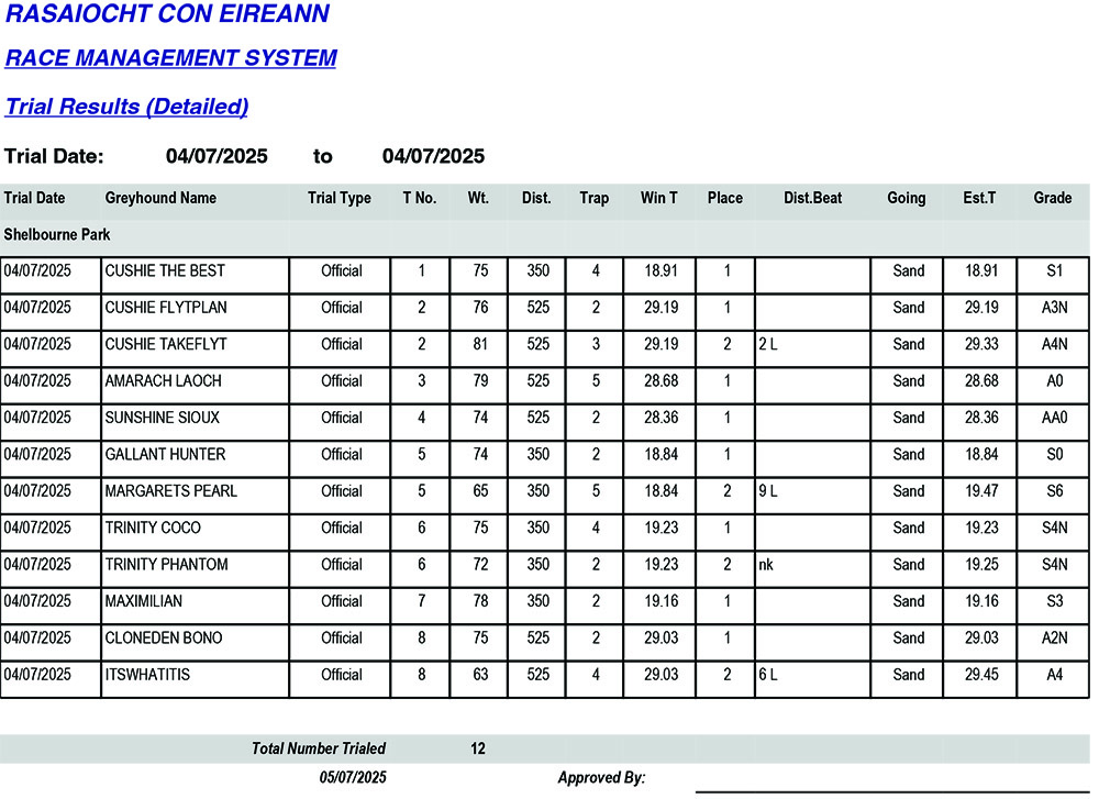 Shelbourne Park Trial Results Friday 4/07/2025:
