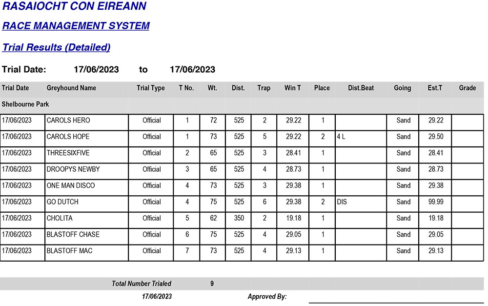 Shelbourne Park Trial Results, Saturday 17/6/2023: