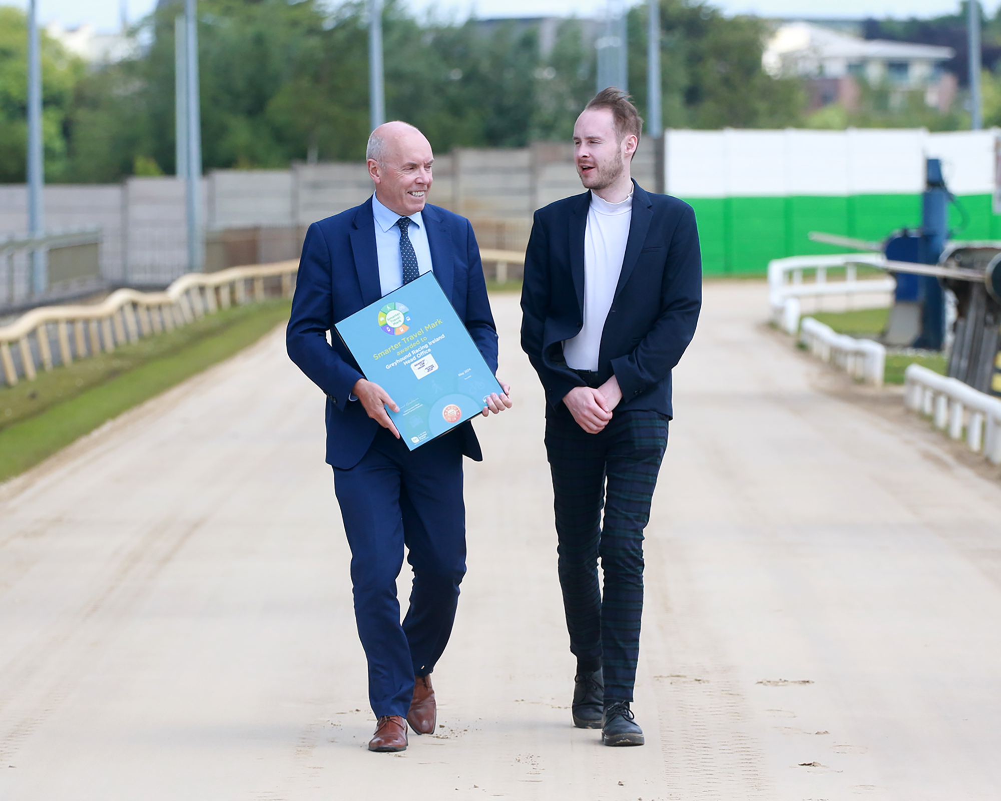 Tim Lucey CEO of Greyhound Racing Ireland and Shane Hayes, Representative from Smarter Travel announcing that Greyhound Racing Ireland (Head Office) have been awarded the Smarter Travel Mark (Bronze Level). This award highlights the organisations commitment to sustainable travel and community engagement.