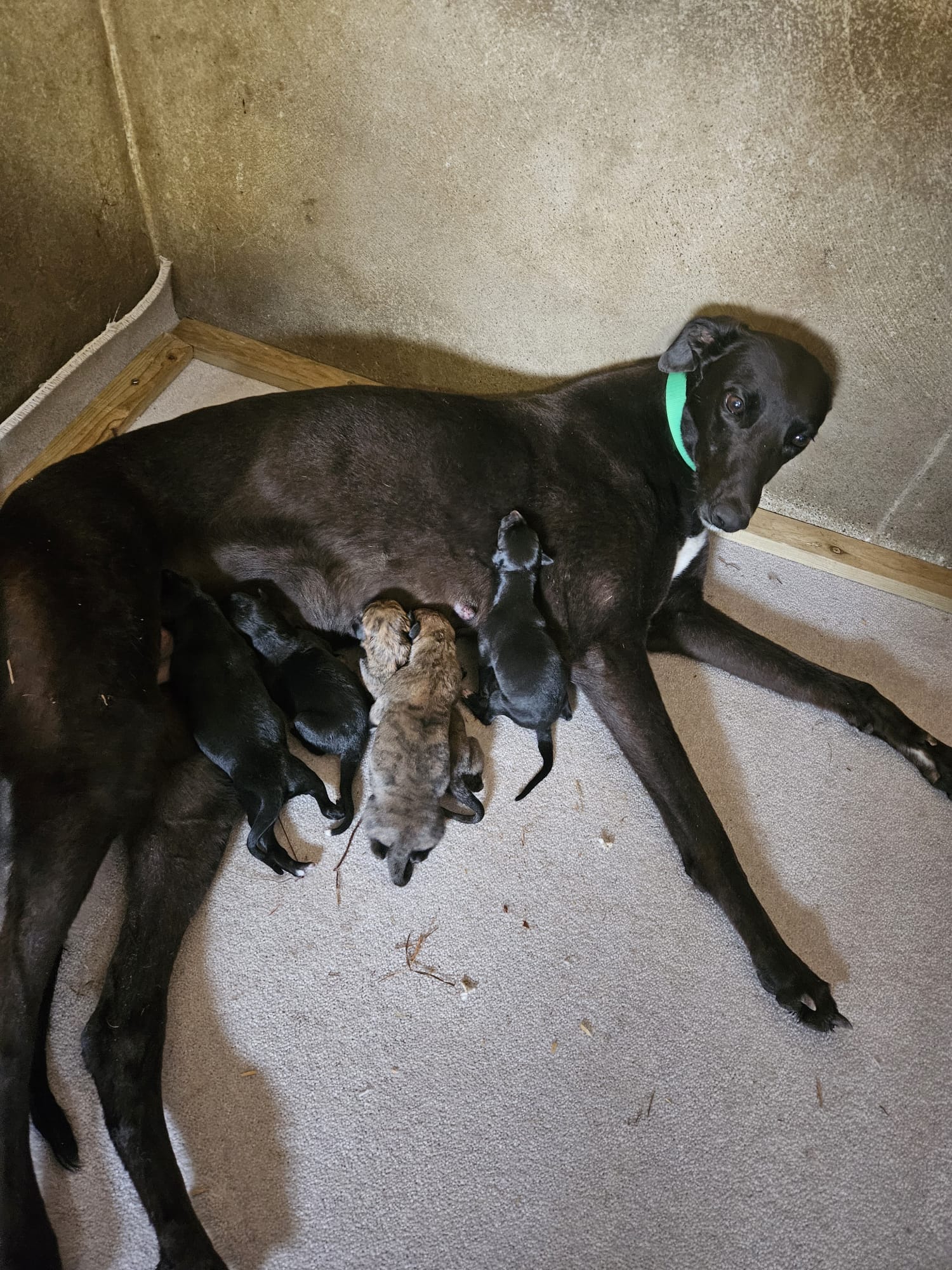 The daughter of Droopys Sydney and Coolavanny Ella, who is a full sister from a repeat mating to Coolavanny Hoffa amongst others, has just had a litter of five (Four bitches and one dog) to Dorotas Wildcat Pic right and Peter McManus reports that both mum and pups are doing great.