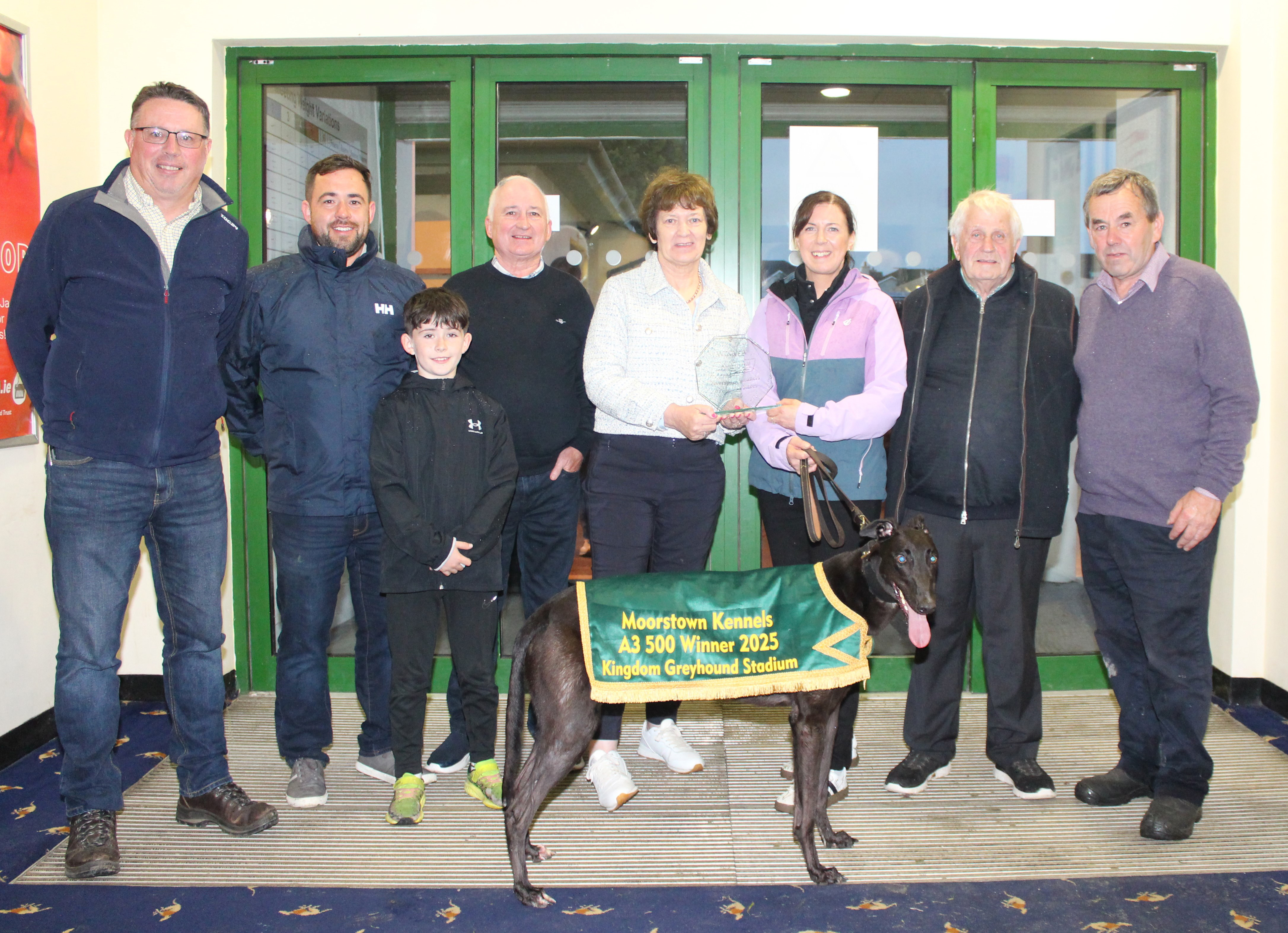 Pictured: Helen O'Flaherty making the winning presentation to Sandra Guilfoyle following Magical Luka's win in the final of the Moorstown Kennels A3 500 yard Stakes at the Kingdom Greyhound Stadium on Friday night with Kieran Casey Racing Manager, Sean O'Keeffe, Sean Óg O'Keeffe, Jim Kennedy, Joe O'Flaherty and John O'Keeffe.