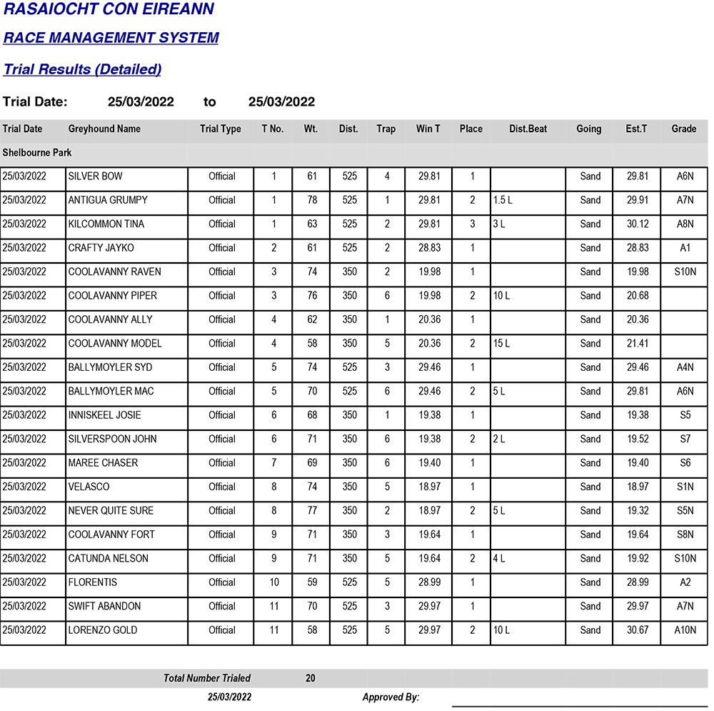 Shelbourne Park Trial Results, Friday 25/03/2022: