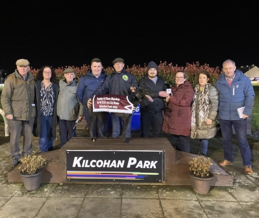 Owned by the Foxcall-Syndicate, TINAHUE BRODIE landed the feature in Kilcohan Park on Saturday night as the 6-4 favourite stroke gold in the final of the €2,800 Paddy & Ciara Sharkey Bookmakers A2/A3 final.