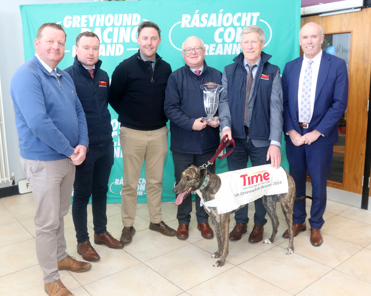 Derek Frehill (Director of Racing), Shane Rigney (TIME), Leon Blanche (CCO), Willie Rigney (TIME), John Fox (TIME) and Tim Lucey (CEO Greyhound Racing Ireland) announcing details for sponsorship for 2024, including the Cesarewitch commencing on Sunday 10th March in Mullingar Greyhound Stadium.