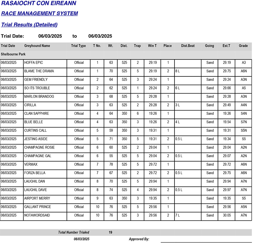 Shelbourne Park Trial Results, Thursday 6/3/2025: