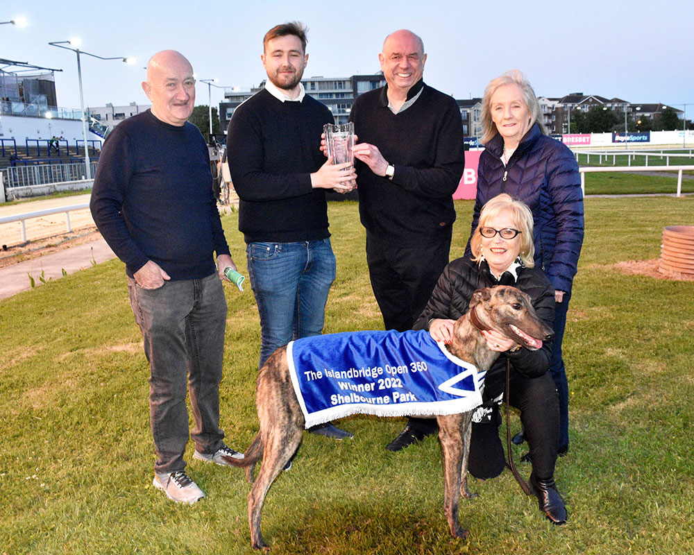 Presentation of trophy after Off the pitch won the 2022 Islandbridge Open 350 at Shelbourne Park. Pictured are joint owner Stuart Kenny, Cillian Murphy Racing Support Officer, Pat Flanagan joint owner, Diana Flanagan and trainer Marie Gilbert. Pic: Imelda Grauer