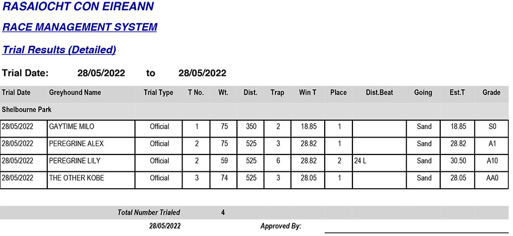 SHELBOURNE PARK TRIAL RESULTS, SATURDAY 28/05/2022