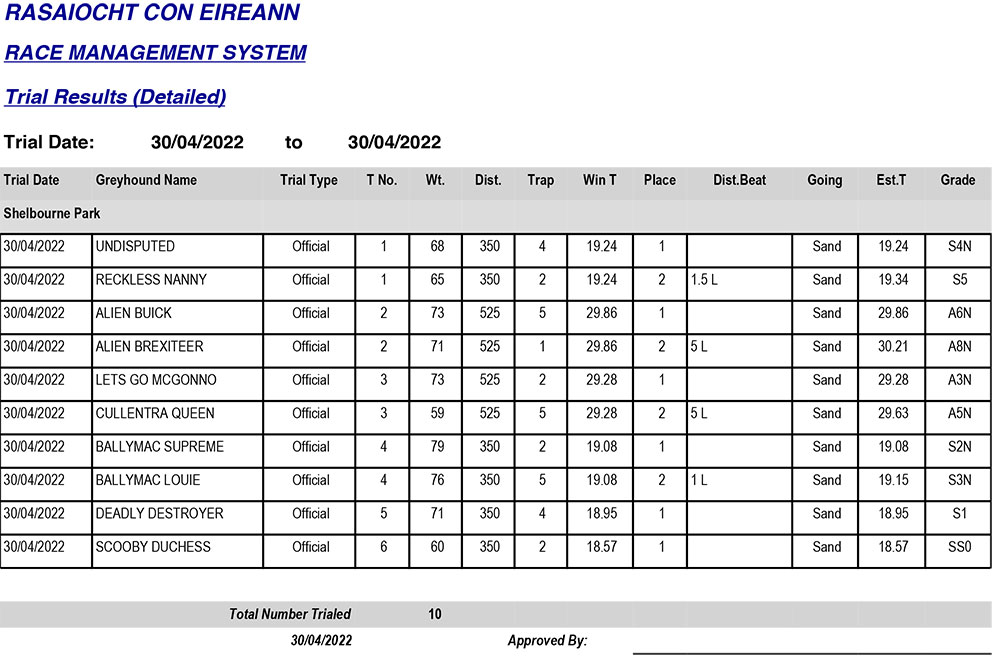 Shelbourne Park Trial Results, Saturday 30/04/2022: